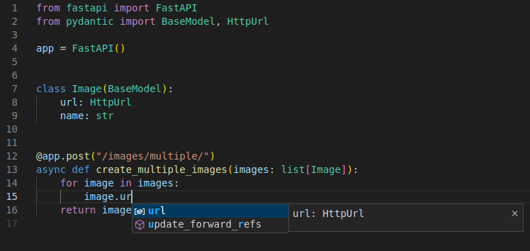Например, так как в модели Image у нас есть поле url, то мы можем объявить его как тип HttpUrl из модуля Pydantic вместо типа str: